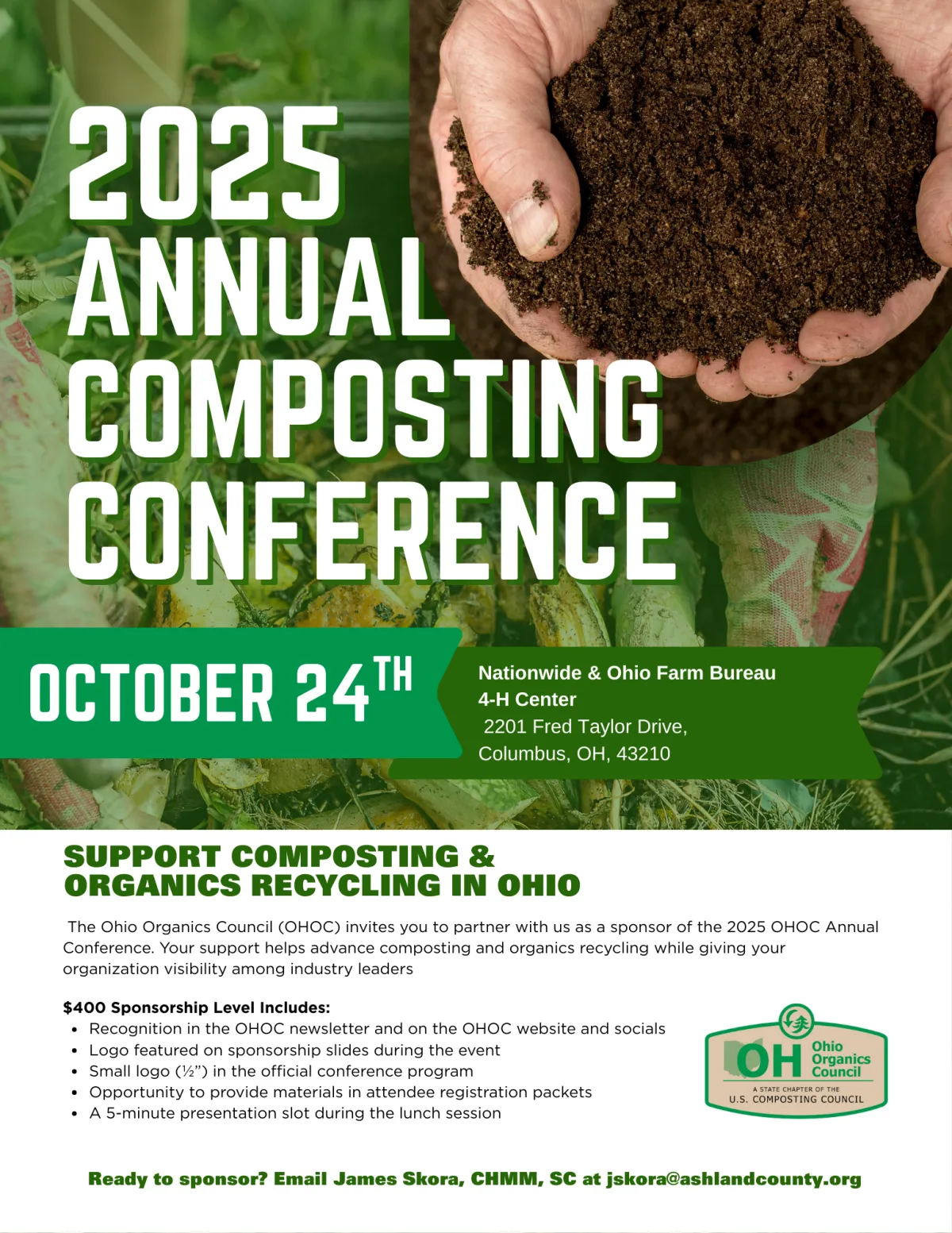 The Ohio Organics Council (OHOC) invites you to support the advancement of composting and organics recycling by becoming a sponsor of the 2025 OHOC Annual Conference. For more information, please contact James Skora at [email protected] or 419-282-4338.
